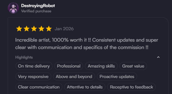 • While I'm working on your commission, I will make reviews/updates (such as sending watermarked work-in-progress images) with you, unless agreed otherwise.